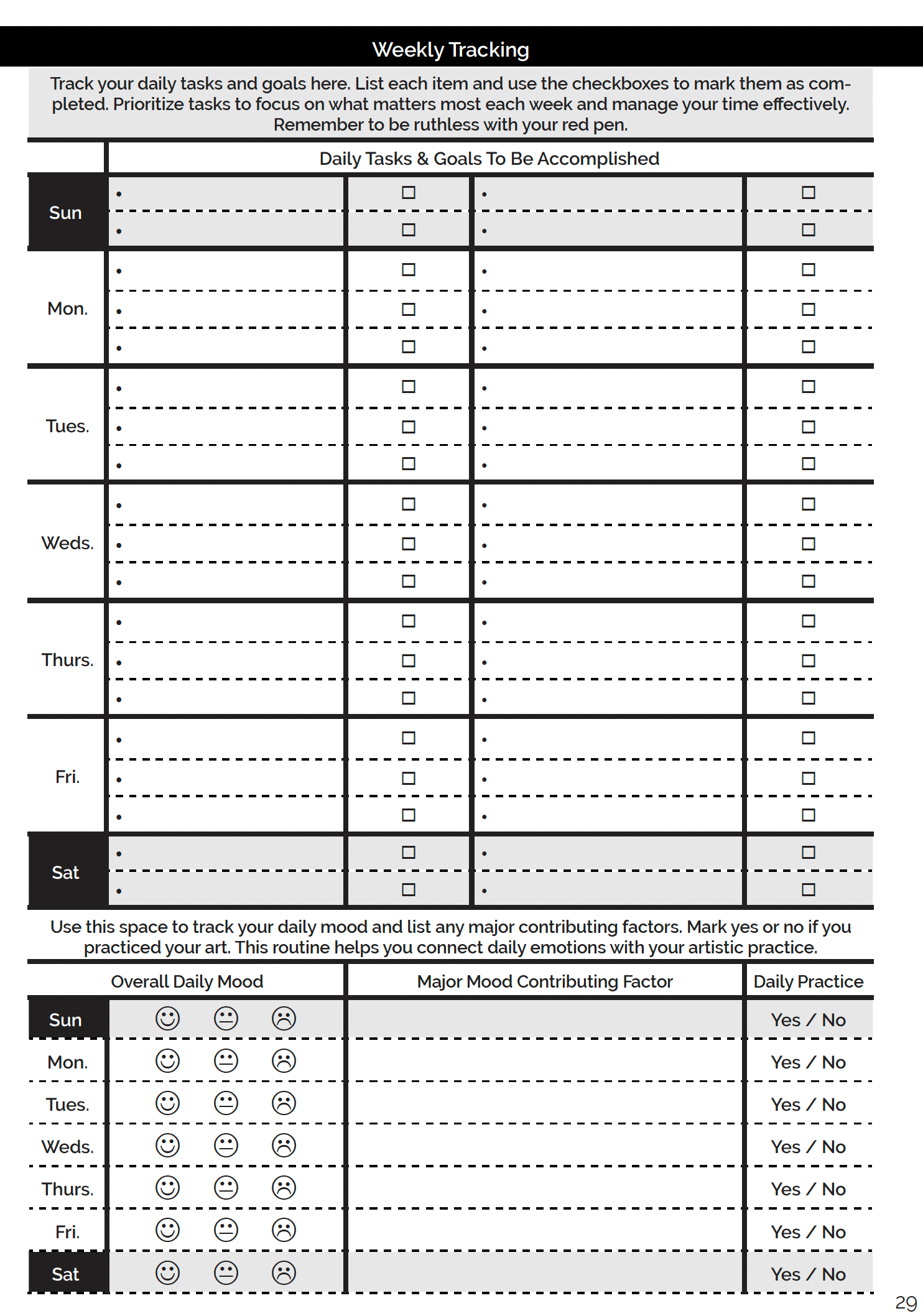 - Comprehensive Artistic Framework: Incorporates a 1 Year/12 Month/52 Week layout, thoughtfully structured to meld detailed project planning with spaces for creative expression and reflection.