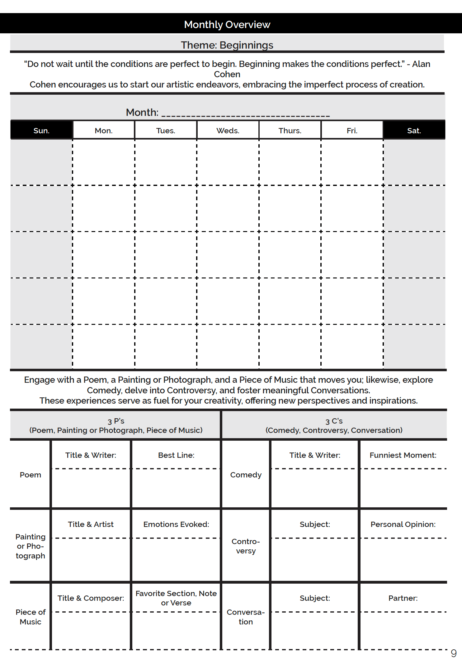- Inspiring Monthly Artistic Themes: Each month is centered around a distinct artistic theme, accompanied by motivational quotes and art references, to ignite your imagination and deepen your artistic engagement.